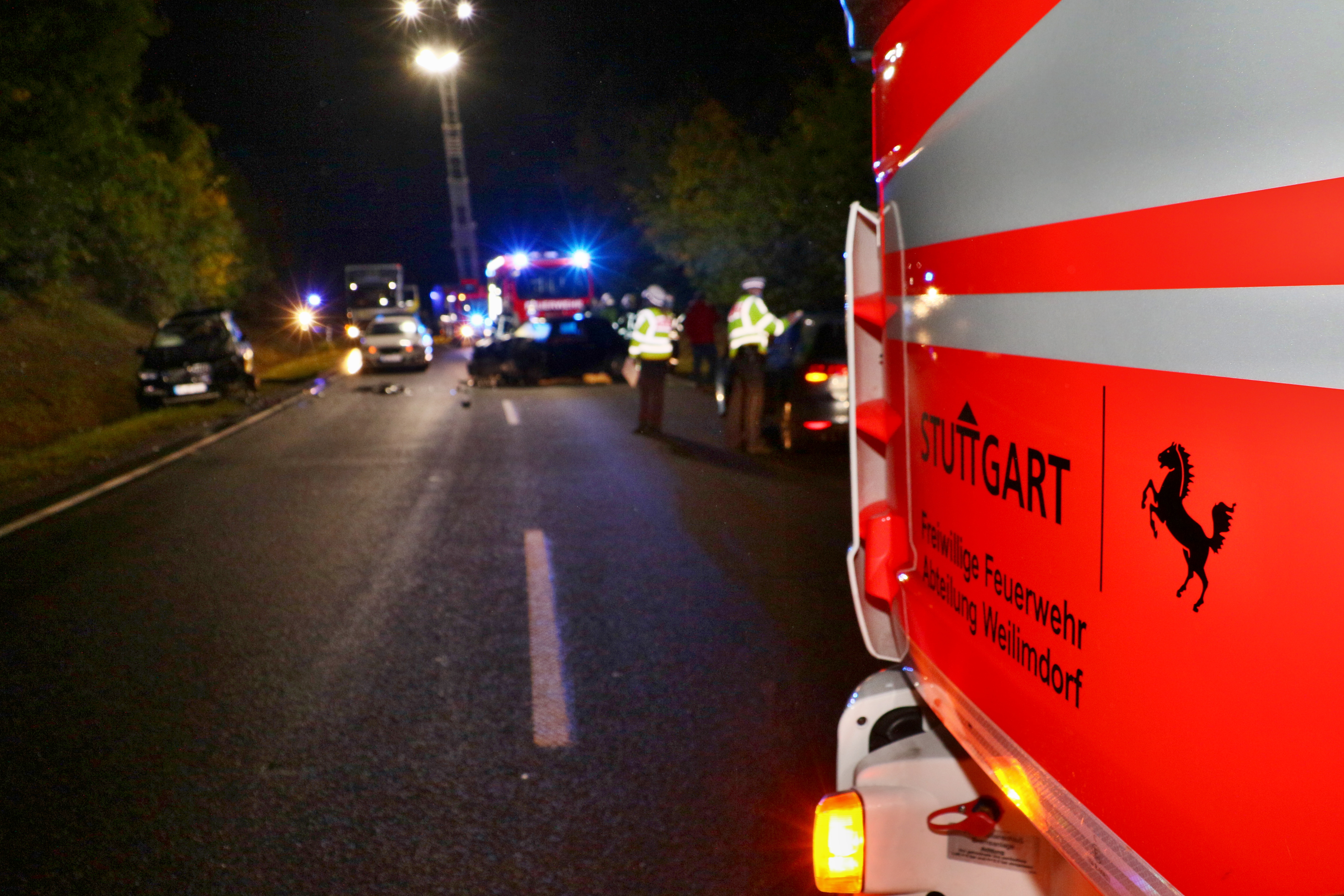 [ps] Am Donnerstagabend gegen halb sieben ereignete sich auf der Bundesstraße 295 ein Verkehrsunfall zwischen zwei PKWs, bei dem zwei Menschen schwer verletzt wurden. Aus bisher ungeklärter Ursache kam ein stadteinwärts fahrender Mini in einer langgezogenen Linkskurve von seiner Fahrspur ab und prallte mit einem entgegenkommenden BMW frontal zusammen. Beim Eintreffen der Feuerwehr waren die zwei Verletzten durch Ersthelfer bereits aus ihren Autos gerettet worden. Die Feuerwehr übernahm umgehend die medizinische Erstversorgung bis zum Eintreffen des Rettungsdienstes. Die Einsatzstelle wurde abgesperrt und ausgeleuchtet. Während der Ausleuchtung für die polizeiliche Ermittlungsarbeit kam es zu einem Brandmeldealarm in der Akademie Schloss Soliutde. Die Weilimdorfer Kräfte konnten sich frei melden und rückten in Richtung Schloss Solitude aus.