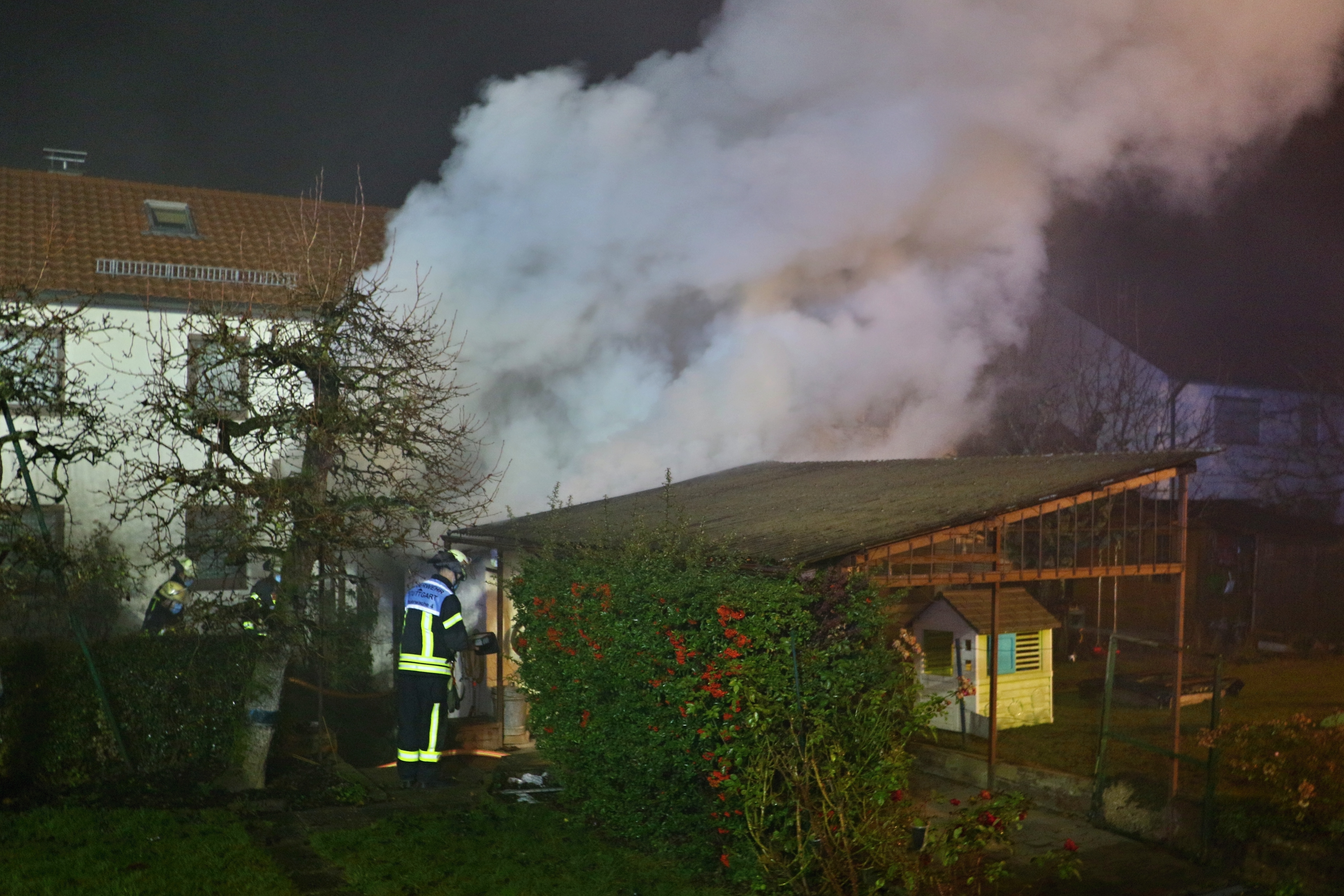 [ps] In der Nacht zum Sonntag meldete ein Anrufer über den europaweiten Notruf 112 einen Brand einer Gartenlaube im Unkenweg im Stuttgarter Stadtteil Bergheim. Die Gartenlaube grenzte direkt an ein unbewohntes Reihenhaus an. Beim Eintreffen der Feuerwehr stand das Gartenhaus im Vollbrand. Umgehend wurde mit einem Löschrohr die Brandbekämpfung eingeleitet und das leer stehende Haus auf Personen kontrolliert. Nach kurzer Zeit konnte Feuer aus gemeldet werden. Wie es zu dem Brand gekommen ist, ist noch unklar.