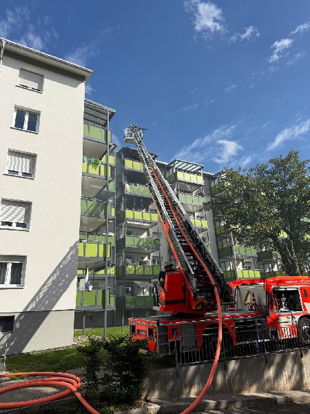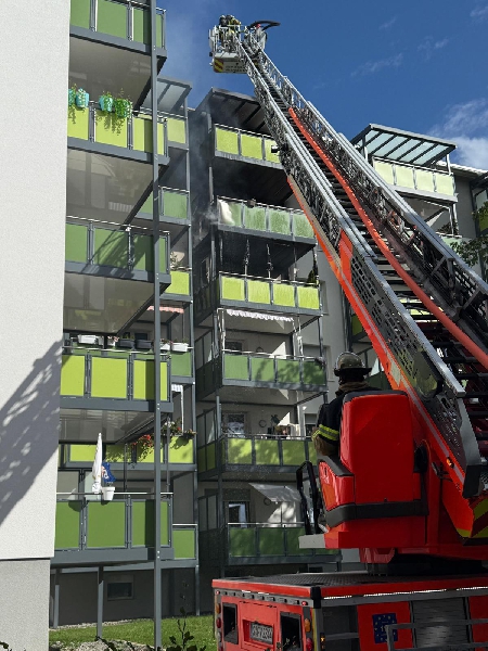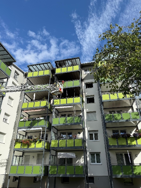 [si] Am Dienstagnachmittag wurde die Feuerwehr zu einem Brand in einem Mehrfamilienhaus in der Mittenfeldstraße alarmiert. Gegen 15:20 Uhr hatten Zeugen Feuer auf einem Balkon im 5. Obergeschoss entdeckt. Die Flammen griffen auf angrenzende Balkone über, zudem drang Rauch in mehrere Wohnungen ein. |