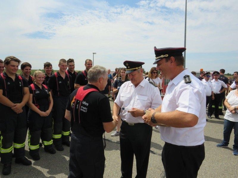 Schweißperlen rinnen über die Stirn und Anspannung liegt in der Luft. So in etwa ließ sich der vergangene Samstagvormittag für neun Frauen und Männer der Freiwilligen Feuerwehr Weilimdorf beschreiben. Bei 30Grad im Schatten und strahlend blauem Himmel stand die Abnahme des silbernen Leistungsabzeichens für Jürgen Staiger (Gruppenführer), Patrick Schöffner (Maschinist), Moritz Berger, Marcel Hafner, Pascal Raub, Selena Schroff, Patrick Stemmer, Florian Vajda und Valentin Wetzel auf dem Programm. Monatelange Übungsabende, gemeinsam erlebte Hochs und Tiefs, sowie eine enge Gemeinschaft sind nicht die einzigen Resultate der Vorbereitung auf diesen besonderen Tag. Nachdem am Freitagabend die letzten Vorbereitungen getroffen wurden, das Löschfahrzeug nochmals auf Hochglanz poliert und die Ausrüstung ein letztes Mal kontrolliert wurde, ging es am Samstag pünktlich um 9.30Uhr in Richtung Künzelsau los, wo an diesem Wochenende die Abnahme der Leistungsabzeichen in Bronze, Silber und Gold angeboten wurden. Vor Ort angekommen wurde das Gelände erkundet und während einer kleinen Stärkung den bereits sich in der Prüfung befindlichen Gruppen zugeschaut, um sich vollends auf die eigene, in wenigen Augenblicken beginnende Abnahme einzustellen. Neben den neun Prüflingen waren auch zahlreiche Eltern, Freundinnen und Kameraden der Freiweilligen Feuerwehr Weilimdorf nach Künzelsau angereist, um tatkräftig zur Seite zu stehen und emotionalen Beistand zu leisten. Und es hat sich durchaus gelohnt – souverän und ohne Fehlerpunkte absolvierten die neun Frauen und Männer der Feuerwehr Weilimdorf die Prüfung, welche sich aus zwei Teilen, einem Löschangriff, sowie einer Verkehrsunfallübung zusammensetzte. Nach einer kurzen Pause und Fertigstellung der Urkunden, war es dann so weit und die Auszeichnung der sichtlich erleichterten Teilnehmer stand an. Voller Stolz und mit einem breiten Lächeln im Gesicht, wurde die Truppe von den beiden zuständigen Kameraden der Feuerwehr Künzelsau mit ihren silbernen Anstecknadeln ausgezeichnet und mit herzlichen Worten geehrt.